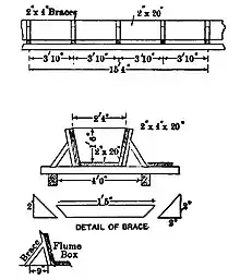 Log flumes need a steady supply of water. Often, a log pond or artificial reservoir serves this purpose.[4]:16 The head directs the flow of water into the top of the flume. Flume boxes are built tight with lumber free of knots to prevent leaks. Feeder troughs resupply water on long routes.[1]:410
