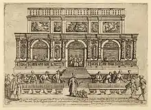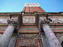 The building of the loggetta was a part of the renovatio urbis,[4] the ambitious programme of architectural renewal, begun under Doge Andrea Gritti, that was aimed at reaffirming Venice's international prestige after the earlier defeat at Agnadello during the War of the League of Cambrai and the subsequent Peace of Bologna which sanctioned Habsburg hegemony on the Italian peninsula at the end of the War of the League of Cognac. It amounted to the transformation of Saint Mark's Square from an antiquated medieval town centre with food vendors, money changers, and even latrines into an imposing public forum in emulation of ancient Rome. Specifically, the loggetta was modelled along the lines of ancient triumphal arches and was intended as a monumental backdrop to provide a sense of grandeur to public ceremonies. Many of the key architectural elements, including the paired columns and niches with statues, had in fact already been employed by Sansovino for the temporary wooden arches that he designed and erected in Florence in 1514 for the ceremonial entry of Pope Leo X into the city the previous year.[5][3][6]
