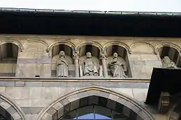 The two loggias are surmounted by a series of triple mullioned windows, housing statues. These were realized by Ugo da Campione and his son Giovanni, by other masters from Campione d'Italia and Tuscany, in the 14th century.