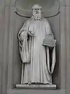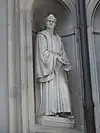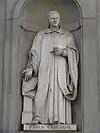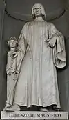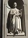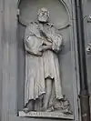 The project was restarted in 1834-1835 as an initiative of the editor and philanthropist Vincenzo Batelli,[2] who wished to celebrate the Italian genius. Initially, he hoped to fund his project with a public subscription and engage young local artists, early in their careers.[3] Public funding, however, fell far short of what was needed. In 1842, the Grand-Ducal government selected a "Florentine Deputation to complete the decoration of the Logge degli Uffizi and honor Illustrious Tuscans". The deputation selected the subjects and approved the statues based on designs with no modifications allowed.[4] Their choices guided by the government of the Grand-Duchy. For example, the suggestions for including Frate Guittone d'Arezzo (1230 – 1294) and the jurist Cino da Pistoia (1270 – 1336) were declined. Ultimately the project was funded by a lottery, and experienced sculptors were patronized. Prior to installation or completion of the statues following sculptors died: Bartolini, Pampaloni, Pozzi, Nencini, Leoni, and Torrini.[5] The original sculptor for the statue of Guicciardini declined the commission, believing the historian had not been evil.?! The series was completed in 1856.[6]
