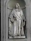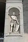 In addition, to hosting the entrance to the museum housed in the upper galleries, the loggiato is known for its display of statues of famous Tuscans housed in niches carved from the inner ground floor pilasters. It is stated that Cosimo I de Medici for his original plan for the Uffizi planned to display statues of famous Tuscans in the ground floor. In 1574, just before the death of Cosimo, the sculptor Vincenzo Danti had his statue of the former Duke placed in the ground floor.[1] His son, Francesco, in 1584 substituted this statue with one by Giambologna, standing on a plinth on the second floor, above the arches of the interior of the river corridor, with Cosimo flanked by two figures, Rigor and Equity. However, not until the middle of the 19th century, was such an ambitious plan to display a statues of 28 famous Italians active in Tuscany was put into effect.