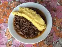 In the area of Bergamo and Brescia is known the dish of polenta e osei, where birds such as thrushes or larks are browned in butter or on the spit and served together with polenta,[13] to which is added the pork alla bresciana.[14] In the province of Mantua, beef stew and donkey stew are common: in general, stews are quite common in the lowlands, as in the case of Pavia-style stew.[15]