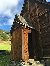 The earliest existing historical records of the church date back to the year 1325, but the church was not new that year. The wooden stave church was established during the late 12th century. Through 20th-century dendrochronological dating the logs of the church were dated to the year 1192, so the church must have been built around that time. Originally, the church was named "Hvams kirke". The church has a rectangular nave, a narrower and lower chancel, and a small sacristy on the south side of the chancel. The church is supported by four columns, and has three lavishly carved portals, chancel-arches, and column capitals.[3][4][5]