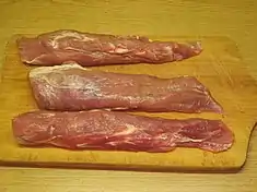 Pork tenderloin, also called pork fillet,[1] pork steak[2] or Gentleman's Cut, is a long, thin cut of pork.