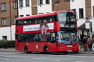 The 120 was one of the five routes in London to use the first fully accessible low floor single deckers in 1994: it gained 10 Wright Pathfinder bodied Dennis Lance SLFs.[5] These entered service on the route on 29 January 1994, making the route the first in Britain to be run entirely with low-floor vehicles; comparable vehicles previously delivered to Merseyside PTE and Tayside Buses had been used alongside step-entrance vehicles.[1]