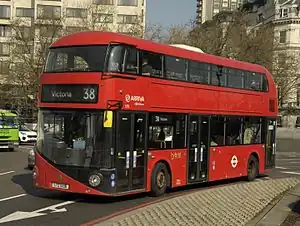 On 29 Oct 2005, route 38 was converted to one man operation with the AEC Routemasters replaced by 46 Mercedes-Benz O530G articulated buses.[4][5] Double deck buses were introduced on 14 November 2009 as part of the Mayor of London's policy to withdraw articulated buses from London. The frequency of the route was increased to every 2–3 minutes.[6]