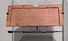 The local waterlogged soil conditions then preserved even organic material like leather shoes[10] and a large assembly of wooden writing tablets of which over 400 were found. The tablets originally held a layer of dark wax and messages were scratched into the wax with a stylus that revealed the paler wood underneath. The wax has perished, but the words were reconstructed from scratch marks left in the wood.[11] Among the messages is the oldest financial document from London, dated AD 57,[12] and two addresses from AD 62 and AD 70 containing the earliest mention of London.[13]