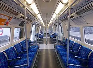 The trains were originally delivered with seats with a mauve and grey moquette. They formed the letter J for Jubilee (the Northern line's moquette formed the letter N). This was replaced in November 2005 with the new dark blue Tube Lines moquette with multi-coloured and multi-size hollow squares, introduced at the same time on the 1973 and 1995 stock. At the same time, the purple armrests were repainted blue to match the new seats.