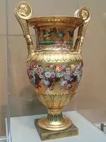 The vase is created using hard-paste porcelain.[1] Hard paste porcelain was not used at the Sèvres Manufactory until the mid-1700s when a large deposit of china clay, a vital ingredient, was found in Limoges, France.[2] The vase is considered in the Etruscan form, due to the large scrolling handles, and was known as a vase étrusque á rouleaux in royal decrees and records surrounding the object.[3] Once the vase was commissioned, various artists were brought in to decorate the lavish porcelain. The vase itself was designed by Napoleon's chief architect, Charles Percier (1764-1838). The decorations around the exterior of the vase were designed by Alexandre-Théodore Brongniart (d. 1813) and were executed by Gilbert Drouet (1785-1825) and Christophe-Ferdinand Caron (active 1792-1815).[1]