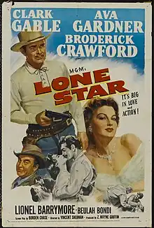 Lone Star is a 1952 American Western film starring Clark Gable, Ava Gardner, Broderick Crawford, Ed Begley, and Lionel Barrymore (in his final role) as President Andrew Jackson. The film also marks the first (uncredited) screen appearance by then-13-year-old George Hamilton, playing beside Barrymore in the role of Jackson's servant.[2]