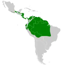 Subspecies H. l. pallidicepts of long-billed starthroat is the northernmost; it is found from southern Mexico through Belize, Guatemala, Honduras, and El Salvador into Nicaragua. The nominate H. l. longirostris is the most widespread. It is found from Costa Rica through Panama, into South America as far south as eastern Peru and eastern Bolivia and east through the Guianas well into Brazil, and on Trinidad. H. l. albicrissa has a restricted range in western Ecuador and northwestern Peru. The species inhabits a variety of humid semi-open landscapes including the edges of woodland, isolated woodlands, pastures with trees, gallery forest, and secondary forest. It shuns the interior of closed forest. It is a bird of the lowlands and foothills that ranges in elevation from sea level to about 1,500 m (4,900 ft).[6]