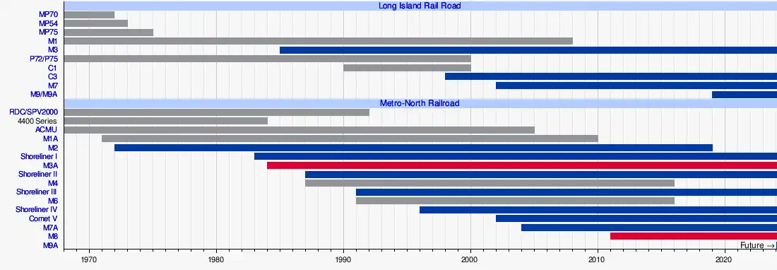 One of the most popular decisions by Governor Nelson A. Rockefeller after the 1966 takeover was replacing the entire electric passenger fleet with M1 cars.[4] It acquired 770 M1 cars built by Budd and General Electric from 1968 to 1974, and 174 M3 cars, built in 1985 and 1986, also by the Budd Company.[5][6]