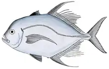 The longfin trevally's colour is variable with age, although maintains a general colouration of greyish blue above, fading to a whitish silver near the belly region. Younger individuals show a more silver blue dorsally, and have six dark crossbars visible on the body past the pectoral fin base.[4] There is a distinct blackish blotch on the upper margin of the operculum.[10] The first dorsal fin is pale grey to black, while the second dorsal fin and anal fin are both hyaline to black. The pectorals are dusty hyaline, the pelvics are usually black with a white leading edge and the caudal fin is also hyaline, with a dusty trailing edge.[4]