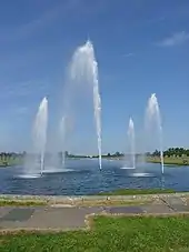 At Hampton Court, the dominating feature of the grounds is the landscaping scheme constructed for the new palace by Sir Christopher Wren. There is a water-bounded semicircular parterre, the length of the east front. Three avenues radiate in crow's foot pattern into Hampton Court Park. The central avenue contains the great canal, known as the Long Water, excavated during the reign of Charles II, in 1662. The design, radical at the time, is influenced by Versailles, and was laid out by pupils of André Le Nôtre, Louis XIV's landscape gardener.[9] At the eastern end of the Long Water is the Golden Jubilee Fountain. This was opened in November 2002 by Queen Elizabeth II, and features five jets, the largest of which rises to a height of 98 feet (30 m).[10]