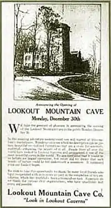 Lookout Mountain Caverns (Lookout Mountain Cave, or Lower Cave) is the second-longest known cave in Hamilton County, Tennessee. Its mapped length of 2.481 miles (3.993 kilometers) places it at 361st on the United States Long Caves List. Unofficially, anecdotal reports of cave expeditions have exceed 12 miles with legends exceeding 82 miles.[1] The cave is closed and public access is forbidden.