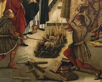 After Villena died in jail in 1434, King John II submitted his library to Barrientos for investigation. Barrientos ordered the majority of the manuscripts burned, but preserved a few.[6]