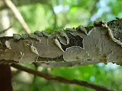 | Fruitbody of the resupinate fungus Lopharia spadicea | |