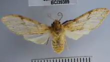 Head and thorax yellow and reddish brown, abdomen pale yellow. Forewing pale yellow with brownish-red tinge and spots. Hindwing pale yellow. Wingspan 34 mm.[3]