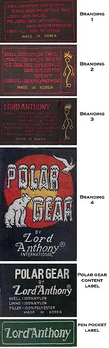 Late period jackets acquired a much more elaborate label with an embroidered design and the "Polar Gear" identity. These jackets lost the "stick man with a crown" Lord Anthony logo on the label; however, they retained the Lord Anthony tag on the sleeve pen pocket. Because the Polar Gear branded label inside the neck line did not include material content details an additional content label was attached near the bottom of the lining. The Polar Gear branding was the last to be used on Lord Anthony snorkel parkas but continued to be used on other padded nylon jackets after production of parkas ceased in the mid-1980s.