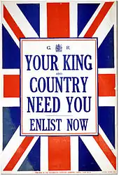 Recruitment posters in general have often been seen as a driving force helping to bring more than a million men into the Army.[33] September 1914, coincident with publication of Leete's image, saw the highest number of volunteers enlisted.[10] The Times recorded the scene in London on 3 January 1915; "Posters appealing to recruits are to be seen on every hoarding, in most windows, in omnibuses, tramcars and commercial vans. The great base of Nelson's Column is covered with them. Their number and variety are remarkable. Everywhere Lord Kitchener sternly points a monstrously big finger, exclaiming 'I Want You'".[10][34] One contemporaneous publication decried the use of advertising methods to enlist soldiers: "the cold, basilisk eye of a gaudily-lithographed Kitchener rivets itself upon the possible recruit and the outstretched finger of the British Minister of War is levelled at him like some revolver, with the words, 'I want you.' The idea is stolen from the advertisement of a 5c. American cigar."[35] Although it became one of the most famous posters in history,[10] its widespread circulation did not halt the decline in recruiting.[10]