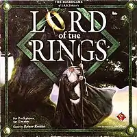 Lord of the Rings is a cooperative board game based on the high fantasy novel The Lord of the Rings by J. R. R. Tolkien. Published in 2000 by Kosmos in Germany, Wizards of the Coast in the U.S., and Parker Brothers in the U.K., the game is designed by Reiner Knizia and features artwork by illustrator John Howe. In the game, each player plays a hobbit in the party, and the party will aim to destroy the One Ring. Upon its release, the game received a Spiel des Jahres special award. A slightly revised version was later published by Fantasy Flight Games.