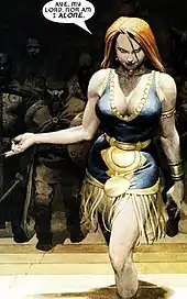 After Loki defeats Thor, reduces all the gods to their knees, and becomes the new master of Asgard, Lorelei returns to the castle and wants payment for helping him achieve his newfound status. She is accompanied by many shadowy figures demanding their due for their part in making Loki master, but Loki grows bored listening to their demands and leaves.[31]