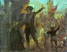 During the so-called 1849 Imperial Constitution campaign, Cantador once again came into the public eye. At the beginning of these riots, on 7 May 1849, the president of the government had again imposed a state of siege on Düsseldorf. On 9 May 1849, the doctor Peter Joseph Neunzig called for open resistance against the Prussian military from Cantador's house on Marktplatz[16] and to support a "provisional government of the Rhenish Republic" founded in Elberfeld (i.e., the Elberfeld uprising).[17] Cantodor did not let Ninety finish his speech, but pushed him away from the window of his house. Until the morning of the following day, bloody barricade fights occurred between members of the vigilantes and Prussian military, resulting in 16 deaths,[18] among them the young painter Ludwig von Milewski. Cantador immediately fled to avoid arrest again.