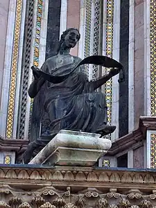 The design of the cathedral's façade is considered to be Maitani's most important work. It is difficult to determine his contributions to the façade as a sculptor. It has been assumed that he influenced the overall design. Two of the panels attributed to Maitani, "Scenes from Genesis" and "The Last Judgment," are delicate bas-reliefs joined by an ascending vine that suggests a French Gothic influence. Sculptures generally attributed to Maitani include the bronze "Eagle of St. John" and the "Angel of St. Matthew."