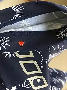 Every Lorna Jane garment includes a heart-shaped bead to signify that it was made "with love". This example is inside the ankle hem of a pair of tights