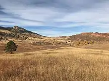 Arthur's Rock and the red sandstone escarpment of the Ingleside Ridge frame this view of the southeast corner of Lory State Park.