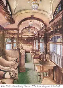 In the beginning the cars of the train were wood; after 1912 steel heavyweight cars started to replace the wooden cars. Until 1936 the Los Angeles Limited was the top train of the Union Pacific as a rival to other Chicago to Los Angeles trains such as Santa Fe's California Limited, De Luxe, Chief, and the Southern Pacific's Rock Island Golden State Limited.
