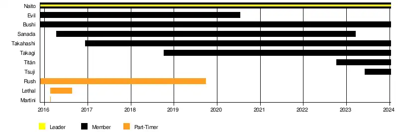Shingo Takagi joined the stable in October 2018 when making his surprise NJPW debut at King of Pro-Wrestling. He would go on to have an undefeated streak as a singles competitor that would last until June 2019.