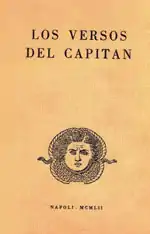 Los versos del capitán is a book by the Chilean poet Pablo Neruda, winner of the Nobel Prize in Literature in 1971. It was published for the first time anonymously in Italy in 1952 by his friend Paolo Ricci.[1][2] The book with his own name in it was first published in Chile, in 1963, with a note written by Neruda explaining why he used anonymity.[3] It is considered that "Los versos del capitan" were dedicated to Neruda's lover Matilde Urrutia, whom he married a few years later.[4]