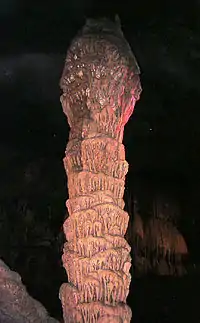 - ↑ The tour pamphlet says the following about the "War Club" stalagmite: "This stalagmite is approximately 500,000 years old and stands 28 feet tall with a base diameter of 2.5 feet and a top diameter of 4 feet. In 1971, Bob Addis, of Parkersburg, West Virginia, secured a platform with ropes to the top of the War Club and began a 15-day-23-hour-and-22-minute stay on top, setting a Guinness World Record for 'Stalagmite Sitting'!"