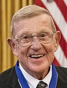 In 1990, Holtz received the Golden Plate Award of the American Academy of Achievement.[47] Holtz was awarded an honorary Doctor of Laws from the University of Notre Dame on May 22, 2011.[48] On April 19, 2012, Holtz was inducted into the Cotton Bowl Hall of Fame.[49] Holtz was also awarded an honorary Doctor of Education from the University of South Carolina on December 17, 2012. Holtz was awarded an honorary Doctor in Public Service from Trine University and elected to the board of trustees in 2011.[50] Trine also honored Holtz in 2013 by naming a program the Lou Holtz Master of Science in Leadership Program.[51] He was also awarded an honorary Doctorate in Communications from Franciscan University of Steubenville on May 9, 2015, and delivered a commencement address.[52] Holtz was elected to the Arkansas Sports Hall of Fame in 1983, and the Upper Ohio Valley Hall of Fame in 1998. On December 3, 2020, Holtz was awarded the Presidential Medal of Freedom by President Donald Trump.[53]