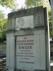 Louis Gustave Binger died at L'Isle-Adam, Île-de-France, France and was buried in the Cimetière du Montparnasse in Paris. The city of Bingerville in the Ivory Coast is named after him.