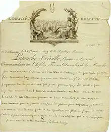 During the Peace of Amiens, Latouche-Tréville was appointed to command the naval squadron of Rochefort,[32] comprising six ships of the line, six frigates and two corvettes,[26] in the fleet of Admiral Villaret de Joyeuse,[2] ferrying 3,000 men of the Army of Rhine for the Saint-Domingue expedition.[26] Latouche fought his way into the harbour of Port-au-Prince, captured its forts and landed the troops.[26] He and General Boudet captured Port-au-Prince and Léogâne. Latouche-Tréville managed to obtain the peaceful surrender of General Laplume, while, in the south, General Leclerc forced Toussaint L'Ouverture and Christophe to submit to French authority.[33]