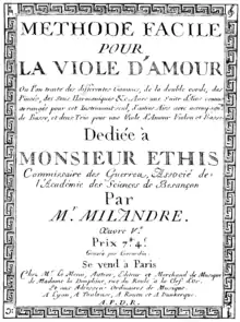 Milandre's Méthode facile pour la viole d'amour (Easy Method for the Viola d'amore), published in 1771[2] (previously thought to be published in 1782), contains thorough information on viola d'amore technique, along with a selection of arrangements and compositions. The method remains an important pedagogical volume.[2]