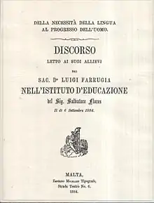 • 1884 – Della Necessità della Lingua al Progresso dell’Uomo (On the Need of Language for the Progress of Man).[2] A 20-page pamphlet in Italian published in Malta (Zefirino Micallef Tipografia) in which Farrugia elaborates on various literary themes around the concept of human progress. The work reproduces a talk given by Farrugia on September 6, 1884, at Flores College, Valletta. Throughout the talk he cites various authors, such as Dante, Manicino, Soave, Blames and others.