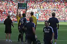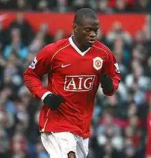 In the 2007–08 season, Saha returned from injury and came as a substitute against Sunderland, scoring the winning goal.[103] On 23 September 2007, Saha won and converted a penalty against Chelsea in Chelsea's first game with Avram Grant in charge. United won the game 2–0.[104] This earned Saha a recall to the French national team after a year out. Against Arsenal, Saha came on to replace the under-performing Carlos Tevez in a 2–2 draw. He was key in setting up a goal as Cristiano Ronaldo gave United a 2–1 lead.[105] Saha continued to make appearances off the bench, but when Wayne Rooney was ruled out for a few weeks he partnered Tevez up front.[106] He then started in a match against Sunderland on Boxing Day, and scored twice including a penalty, winning 2–0 to lift Manchester United to 1st position in the Premier League.[107] After being sidelined with a knee injury that kept him out for a month, Saha made his return in an FA Cup clash versus Arsenal on 16 February 2008, winning 4–0.[108] The following weekend, he came on as a substitute for Ronaldo, scoring the final goal in a 5–1 rout of Newcastle United.[109] After returning to nearly full fitness, Saha's injury haunts returned and forced him off with a hamstring complaint during United's win over Bolton Wanderers at Old Trafford.[110] Saha was ruled out for several weeks, missing key games.[111] In the final game of the Premier League season against Wigan Athletic, Saha was named as a substitute, but played no part in the game.[112] In May 2008, Saha admitted that he believed his United career was in doubt. Despite his desire to stay and love for the club, he was unsure of what the future held for him at Old Trafford.[113]