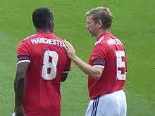 Saha playing alongside Jesper Blomqvist during Manchester United's charity match against Barcelona on 2 September 2017