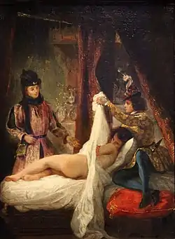 Louis d'Orléans Showing Off His Mistress is an 1825–1826 painting produced by the French artist Eugène Delacroix, now in the Thyssen-Bornemisza Museum in Madrid. It shows Louis I, Duke of Orléans, his chamberlain Albert Le Flamenc and Mariette d'Enghien, who was both Le Flamenc's wife and the Duke's mistress.[1] It draws on an episode recounted in both Prosper de Barante's Histoire des ducs de Bourgogne de la maison de Valois and Brantôme's Vie des dames galantes.[2] It shows strong influence from Rubens and Titian as well as from Richard Parkes Bonington, a British artist with whom he actively swapped ideas and sketches between 1825 and 1828.