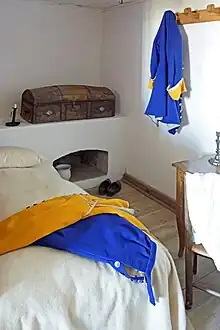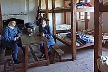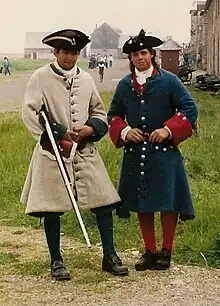 The Louisbourg/Isle Royale Garrison was made up of nine companies of troupes de la marine, including a special artillery company. The garrison also included 150 men from the Swiss regiment de Karrer. At any given time there were between 525 and 575 men in all.[1] Each company was commanded and administered by a fairly autonomous captain, subordinate to the etat-major.[1] Conditions for the soldiers were not good even at their best, which, however, were no worse than many other eighteenth century soldiers.[1] When they did not receive their prescribed rations they were forced to hunt for food. Moreover, although they were supposed to receive an annual issue of clothing, this was not always the case.