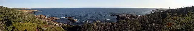 The first part of the trail is suitable for visitors of all skill levels.[2] It begins at the parking area at Lighthouse Point and follows the ocean coast to the east as a 2 kilometres (1 mi) hard-packed gravel partial loop trail. Along this part of the trail are a number of interpretive panels explaining the area's historical significance and natural features including its geography, flora and fauna.[2] There are benches to rest along the trail, as well as lookoffs in strategic places. Sections of the trail, where it passes over a fen and other wet ground are constructed as an elevated wooden boardwalk.[3] The trail is accessible to power wheelchairs and children in strollers and wide enough for two to walk abreast.[4][5] Pets are permitted on the trail but must be leashed and managed by their owners.[6] There are a number of small side paths branching off along this part of the trail, such as the one that gives access to the top of Lighthouse Cliff for an expansive view.[3] The trail follows the coast past Lighthouse Cove, Crows Roost, Morningstar Cove and continues to Western Gun Landing Cove Head where it loops back around toward the start.