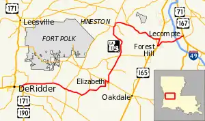 Louisiana Highway 112 (LA 112) is a state highway in Louisiana. It spans 80.9 miles (130.2 km) and runs from west to east. LA 112 is a mostly rural two lane highway with a maximum speed limit of 55 miles per hour (89 km/h) per hour. The western terminus is at an intersection with U.S. Route 171/U.S. Route 190 in Beauregard Parish and the eastern terminus at an intersection with US 167/US 71 in Rapides Parish. Although the highway runs west to east it meanders through three parishes and on the map appears to make a large S.