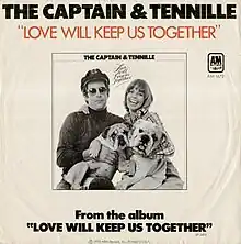 "Love Will Keep Us Together" was the title cut and lead single of Captain & Tennille's debut album, although "Captain" Daryl Dragon originally hoped that honor would go to the duo's rendition of "I Write the Songs". The single rose to number 1 on both the Billboard Easy Listening chart[10] and the Billboard pop chart, staying atop the latter for four weeks starting June 21, 1975. It also hit the top of the 1975 year-end chart. In the US it was the best-selling single of 1975.[11] "Love Will Keep Us Together" was certified gold by the RIAA[12] and also won the Grammy Award (1975) for Record of the Year on February 28, 1976.[13][14]