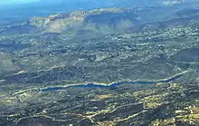 The dam stands 203 feet (62 m) high and spans 765 feet (233 m) across the narrow gorge of the Sweetwater River, 2.4 miles (3.9 km) south of Alpine. It is built entirely of concrete and has a thin arch design. Loveland is the younger of the two dams on the Sweetwater River; the other, Sweetwater, was built in 1888 while Loveland was only constructed in 1945.[3] It is named after Chester H. Loveland, president of the California Water and Telephone Corporation, the firm that built it.[4] The Loveland Reservoir is considered a better water storage facility than Sweetwater because of its much smaller surface area (454 acres compared to 960) and comparable capacity, thus it is less vulnerable to evaporation.[5]
