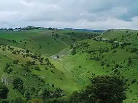 Limestone is porous, so caves, limestone gorges and dry valleys are common features of the area. The soils are mostly derived from loess deposited by cold winds in the last part of the last glacial period.[8] Notable valleys in the White Peak include Dovedale, Monsal Dale, Lathkill Dale and the Manifold Valley. The area is of interest to geologists, since much of the underlying strata have been exposed by extensive quarrying, and can be seen in the old railway cuttings along the Monsal Trail through Monsal Dale and Millers Dale.