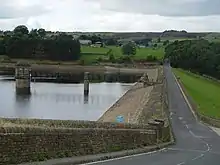 The reservoir has an embankment as the dam head which is straight and extends to a length of 1,010 feet (310 m), a height of 84.5 feet (25.8 m) and which also supports a road between Oxenhope and Stanbury village. The road (since known as Waterhead Lane) used to cut across Sladen valley taking a north west route from Intake Farm and going through the small hamlet of Smith Bank.[9] The hamlet and its mill (which featured in Halliwell Sutcliffe's novel A Man of the Moors[10]) were flooded when the reservoir was completed with the road being diverted northwards onto the dam head.[11] The dam head is concrete with a clay puddle core. There is a spillway at the northern end which drops down to the adjoining waterworks facility.[12]