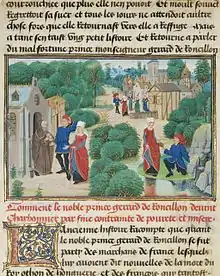 Loyset Liédet – Gerard and Bertha Find Sustenance at a Hermitage, Tempera colors, gold leaf, and gold paint on parchment, J. Paul Getty Museum, written 1463–1465; illuminated 1467–1472